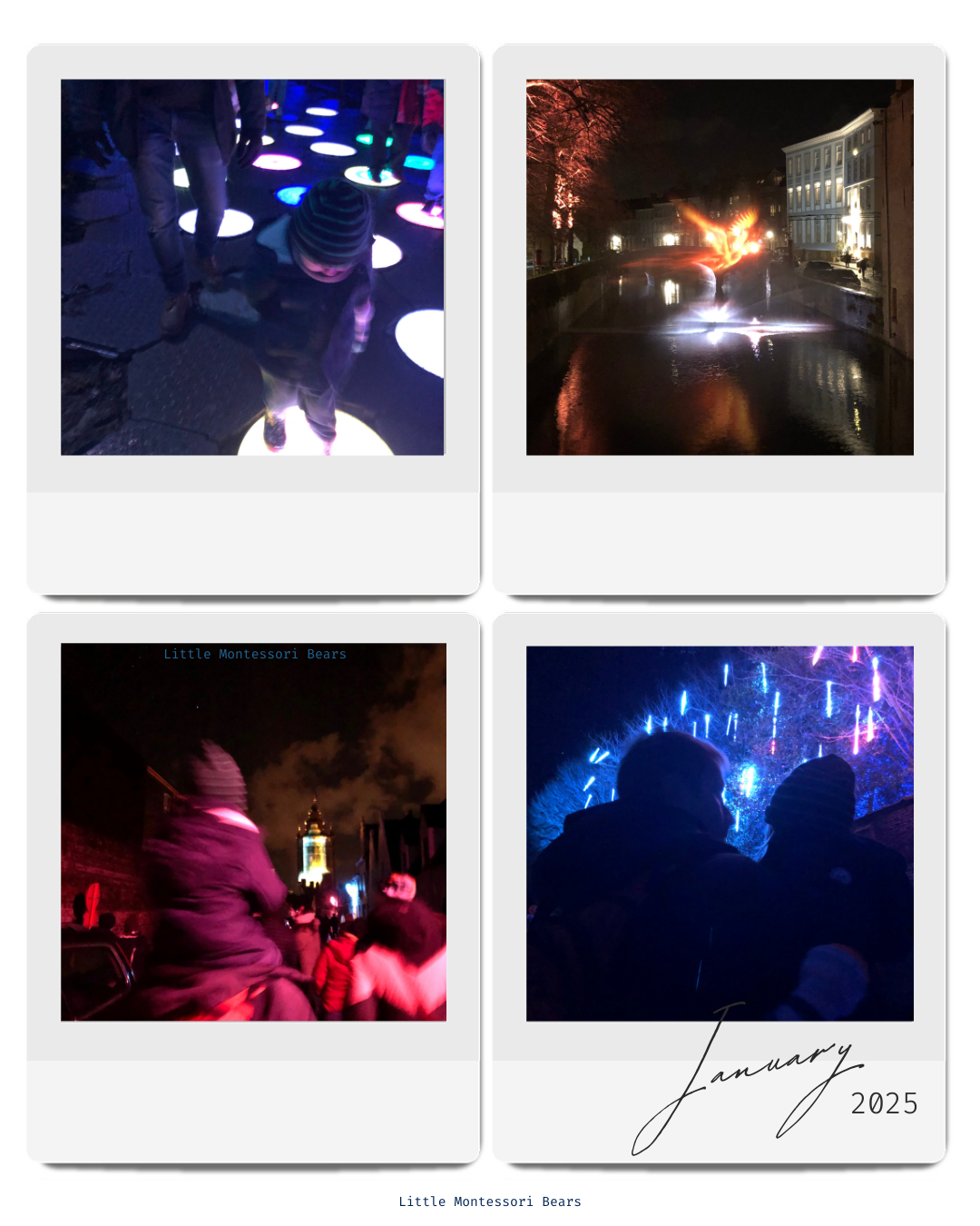 This month we went to Bruges and followed the Light Experience Trail organised during Wintergloed (Winter Glow). It’s a 3km walk through the city and this year the light installations were created around the theme of “Fire & Ice”. I had James wrapped up in the sling against me, and Arthur had taken a nap in the car during the drive and then sat on his dad’s shoulders. Needless to say that this activty was a big hit. Arthur loved all of it, and some installations were interactive! We went in the beginning of the month, and just the other day he was talking about it still! This is definitely an activity we’ll repeat in the future.